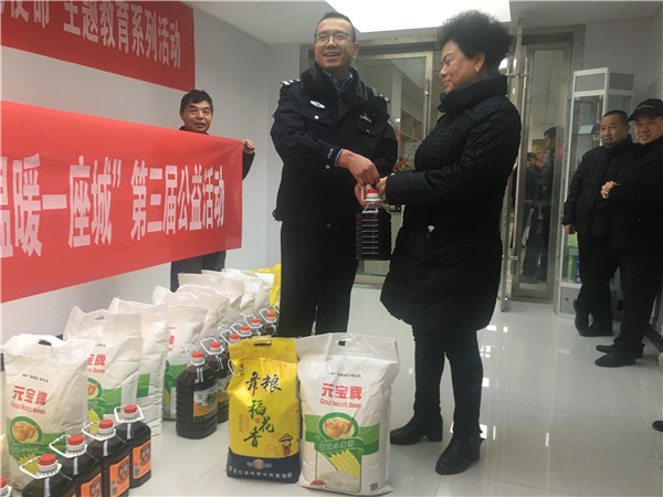 張掖路街道轄區(qū)民警(左)發(fā)放慰問品