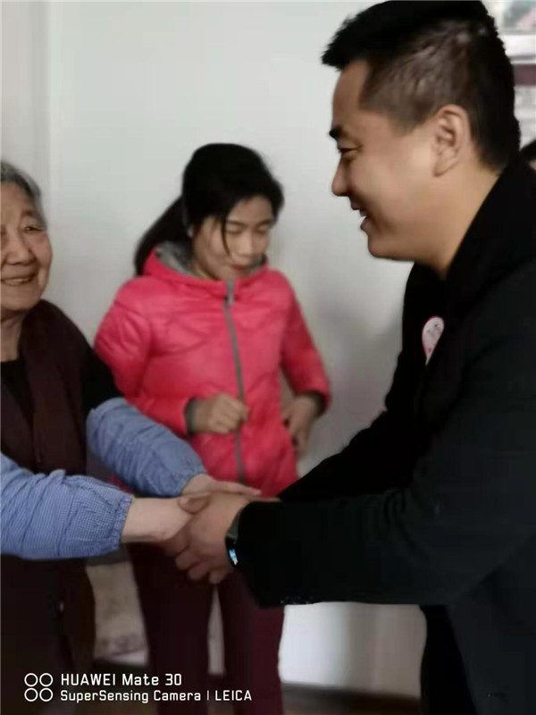 甘肅絲路布衣酒店管理有限公司董事長魏永祥(右)與老人親切握手