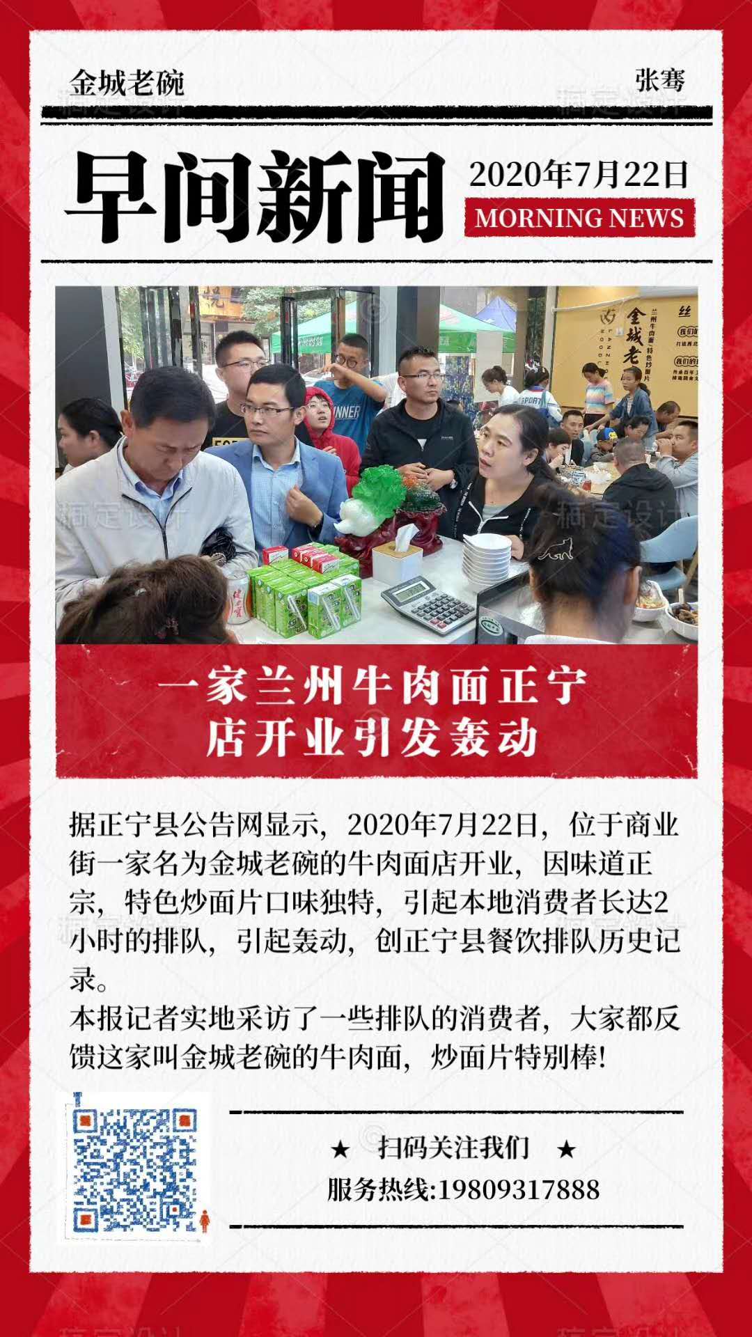 本報記者現(xiàn)場報道:2020年7月22日位于本縣商業(yè)街的一家名為“金城老碗”牛肉面,特色炒面片的餐飲店開業(yè),因口味獨特,味道正宗,導致消費者排隊長達2小時,創(chuàng)下正寧縣餐飲排隊歷史新高。